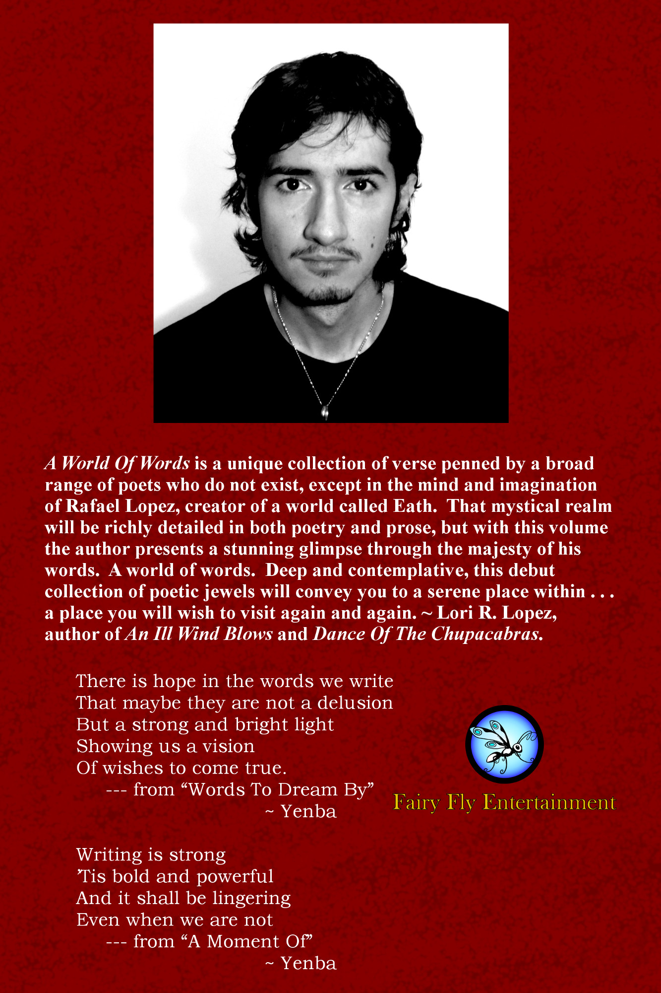 This is like no other poetry book I've read. Rafael takes you on a wondrous journey into his imagination, a spectacular place, to say the least. He paints a picture of a world that rivals the ones depicted in J.R.R.Tolkiens masterpieces, The Lord of The Rings and The Hobbit. Please do not misunderstand what I mean, it is not a knock off, but equal in lustrous mystical quality. His descriptive writing is superb. His charater's are well versed, orignal and interesting. I highly recommend Rafael Lopez's book of poetry 'A World Of Words'. It's worth every second of your time. Also a must read by Rafael are, 'OPON-HUL' and 'Ere The Dark Dirt', from the LASTENBERG tales. Rafael is a briliant young man and author.”