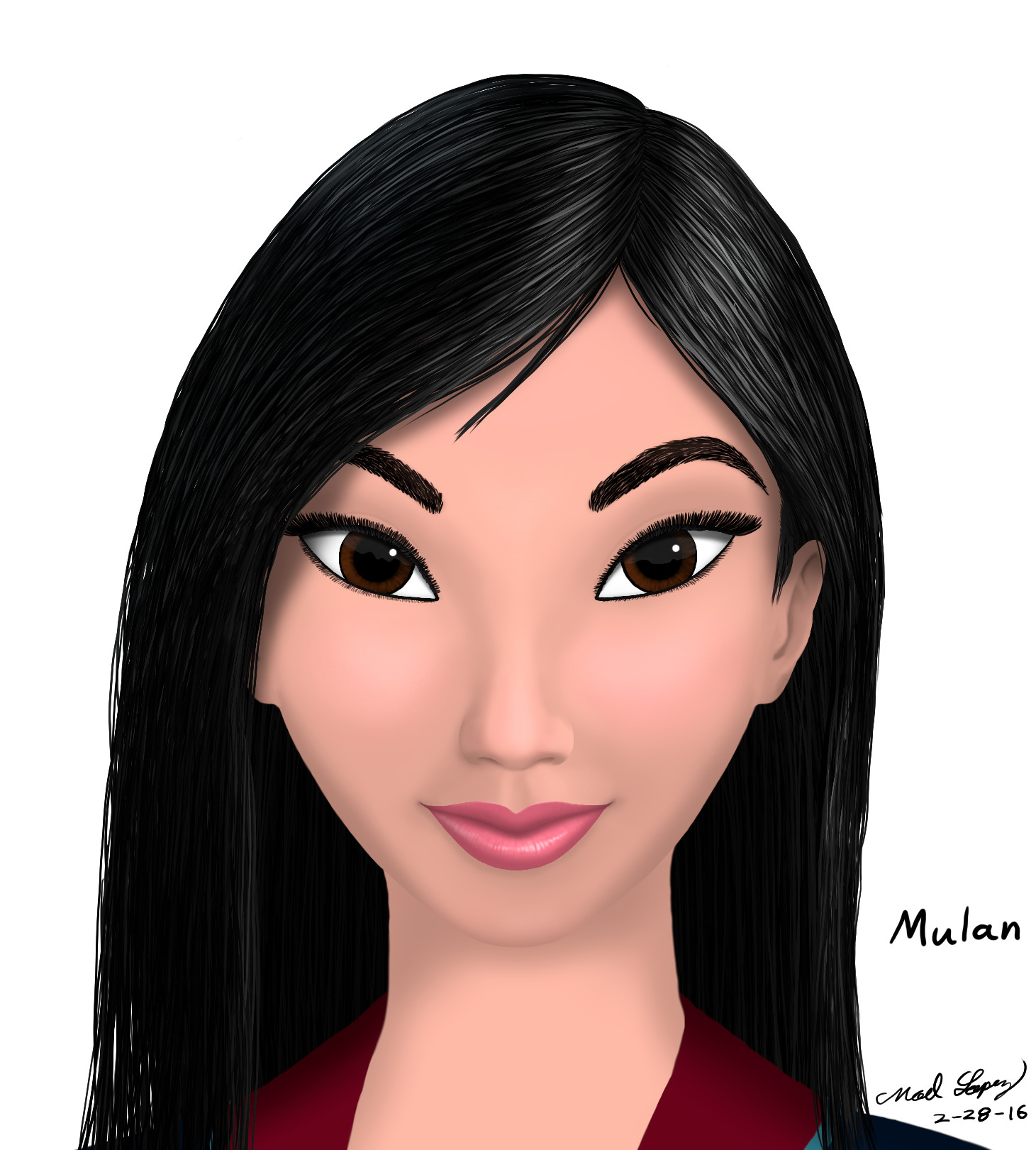 I drew Mulan for Ming-Na Wen (voice actor for Mulan). I gave her a print that I signed to her at the February 2016 LA Comic Book And Science Fiction Convention, and I asked her to sign another copy for me. I was honored to meet her, and she was really nice! She said my drawing was beautiful and she loved the eyelashes.